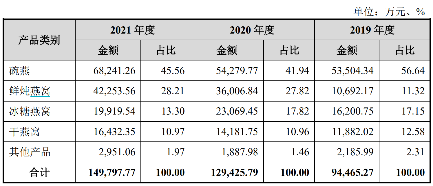2019-2021年,燕之屋营收分别为9.51亿元、12.99亿元、14.99亿元,归属于母公司股东的净利润分别为7910.13万元、1.2亿元、1.67亿元。从产品结构来看,碗燕对公司业绩的贡献将近一半,具体如下: