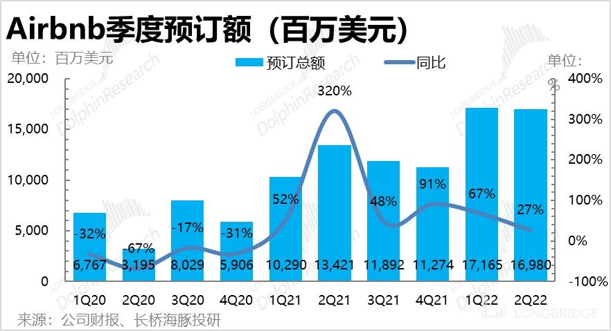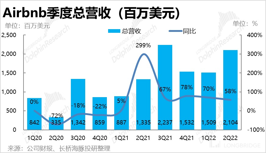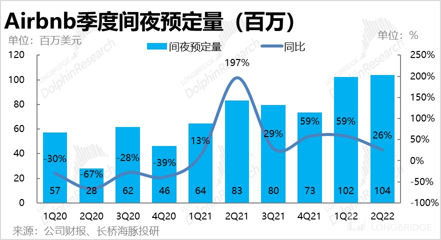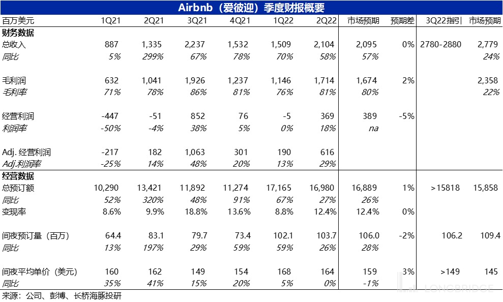 北京时间 8 月 3 日美股盘后,Airbnb 爱彼迎公布了 2022 年二季度财报。总的来看,本度 Airbnb 的营收和利润释放仍保持着强劲增长,但与市场预期基本一致。但间夜预订量本季表现和下季指引都不及预期,不禁让市场担忧出行旅游需求能否保持强劲。海豚君猜测,这也是 Airbnb 在业绩公布后,股价反而大跌 8% 的主要原因,财报详细要点如下:
