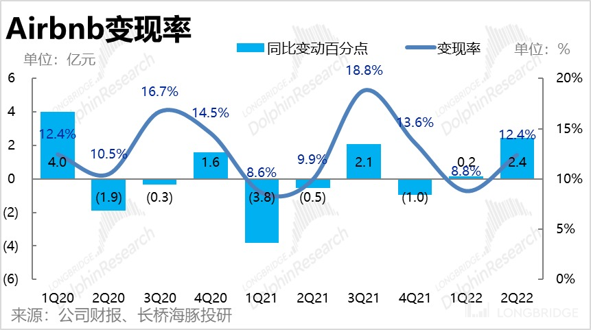2. 变现率稳步提升,营收继续高增:公司本季实现收入 21.04 亿元,略高于市场预期的 20.95 亿元。虽然总订单金额 (GBV) 同比增速放缓,但由于变现率同比增长 2.4pct 到 12.4%,公司营收增速仍达 58%。公司作为唯一的 C2C 民宿出租平台,其变现潜力相较传统 2B 的 OTA 平台会明显更高。随着公司不断推出新服务,本季仍在稳步增长的变现率是除 GBV 外,Airbnb 业绩增长的另一核心驱动因素。