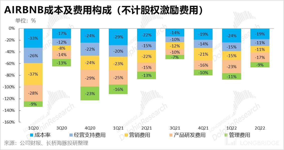 由于 Airbnb 上市不久,股价激励费用支出规模较大且波动显著,因此在看成本和费用时采取剔除股权激励费用后的口径,以更好的观察公司费用的变动趋势。