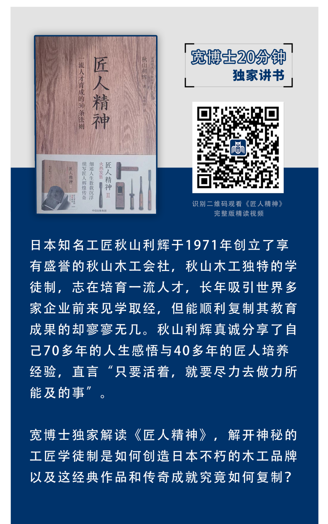 宽博士独家解读《匠人精神》,从日本知名工匠秋山利辉70多年的人生感悟与40多年的匠人培养经验中,探得他创造日本不朽木工品牌背后的商业秘籍以及日本工匠精神的终极根源是什么?**