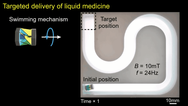 据介绍,这个水陆两用机器人,可以利用磁铁和折纸折叠方式进行多方向基于旋转的移动,在多种环境中移动并执行多种任务,比如受控的液体药物递送和定向固体货物运输等。