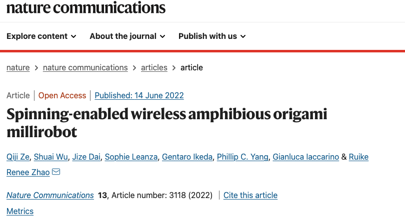相关研究论文以“Spinning-enabled wireless amphibious origami millirobot”为题,发表在科学期刊《自然-通讯》(Nature Communications)上。