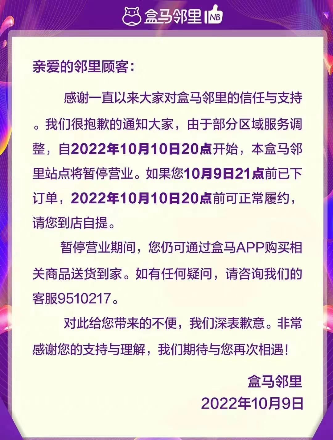 近日,盒马邻里再关两城,杭州与南京地区10月9日最后一天可以下单,10月10日最后一天提货,自此盒马的社区团购业务将仅剩上海大本营保留运营。