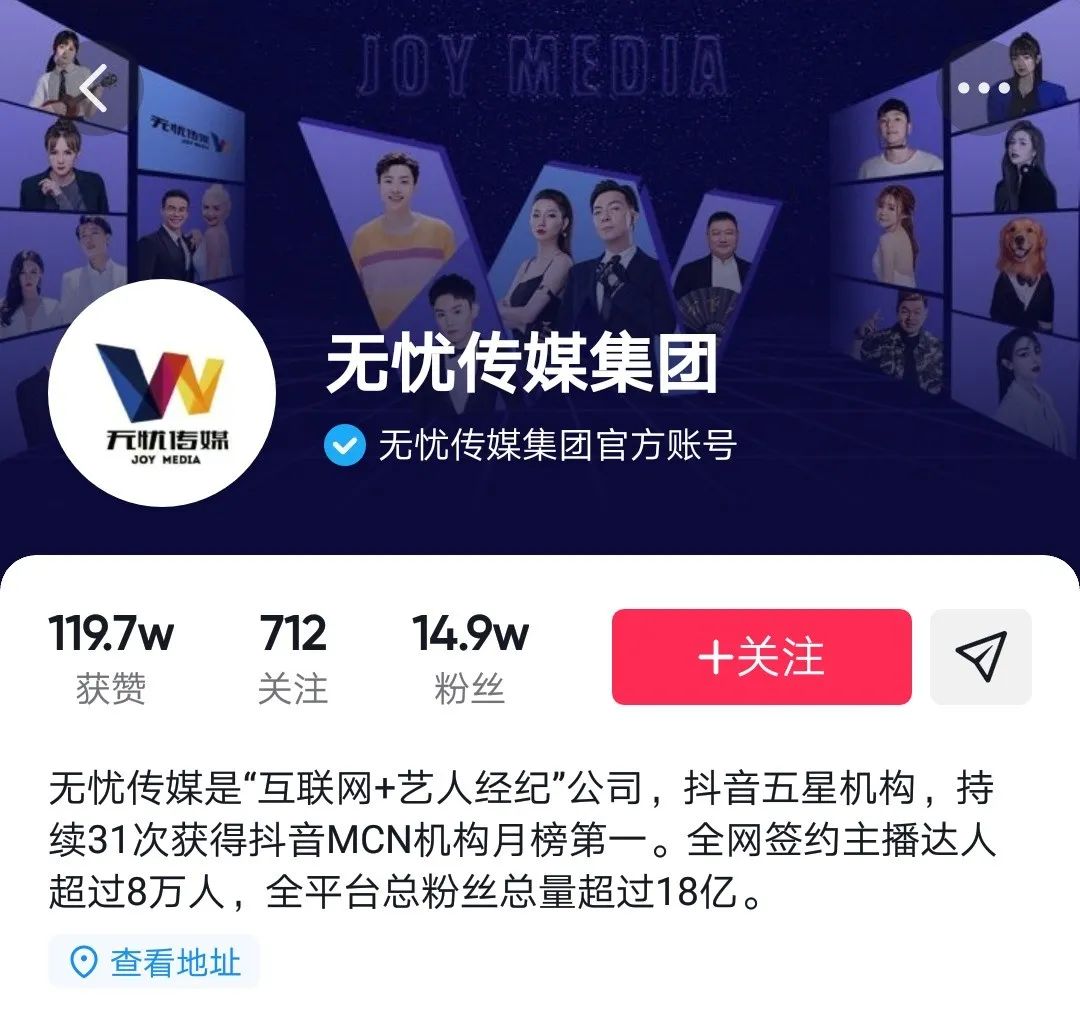 首先,无忧传媒与刘畊宏的合约主要集中在抖音运营。需要了解的是,该机构在业内名头不小,孵化出大狼狗郑建鹏&言真夫妇、多余和毛毛姐、张欣尧、麻辣德子等多位网络红人,在其抖音官方账号的简介中写着:持续31次获得抖音MCN机构月榜第一,全网签约主播达人超过8万人,全平台粉丝总量超过18亿。