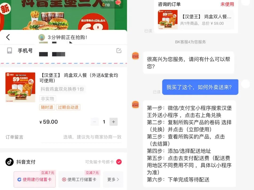 第三种,通过美团,用户下单后获取美团核销码,再去美团重新下单,然后由美团配送体系履约。这种复杂的操作让消费者和商家皆感疲惫。