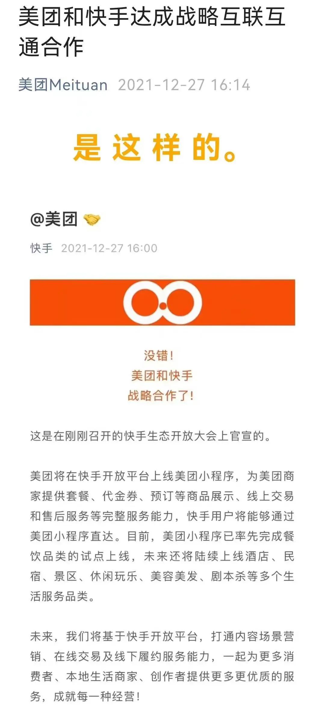 早在2021年底,快手就曾与美团合作。美团在快手开放平台上线美团小程序,为美团商家提供套餐、代金券、预订等商品展示、线上交易和售后服务等完整服务能力,快手用户将能够通过美团小程序直达。