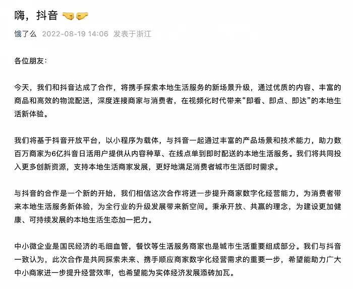 现在,抖音决定与饿了么联手。依据合作,饿了么会在抖音中开发小程序,借用抖音6亿日货为商家提供内容种草、在线点单、即时配送等本地生活服务。双方将投入更多资源,满足消费者需求。