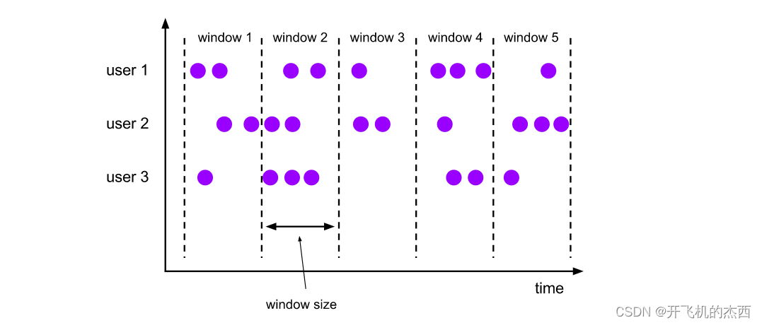 滑动窗口区别于滚动窗口,或者说包含滚动窗口,滑动窗口类似于一个滑块他会以一定的窗口大小按照一个长度的时间步长在时间线上滑动,先比较于滚动窗口而言,滚动窗口是不存在重复数据的但是滑动窗口因为设置的步长小于窗口长度所以会导致产生重复数据。