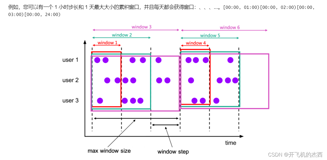 data:是一个表参数,可以是与时间属性列的任何关系。timecol:是一个列描述符,指示应将数据的哪个时间属性列映射到翻滚窗口。step:是指定在顺序累积窗口结束之间增加的窗口大小的持续时间。size:是指定累积窗口的最大宽度的持续时间。 必须是 的整数倍。size``````stepoffset:是一个可选参数,用于指定窗口启动将移动的偏移量。