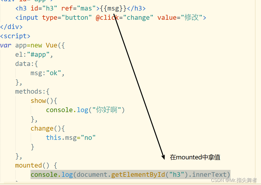 表示内存中的模板已经挂载到页面上,用户可以看到渲染的页面。若要通过某些操作页面上的DOM节点,最早在mounted中