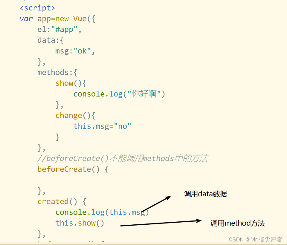 在created()中 data和methods都已经初始化完成,可使用 **最早, **一般打开组件就要渲染的函数就放在created()中