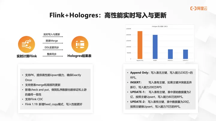 Flink+Hologres组合支持高性能实时写入,右边是我们一年前的实测数据,今年应该会更高一点。可以看到在128CU的配置下,当写入表无主键,那大概每秒钟能写230万条;当写入表有主键,主键冲突丢弃新行,每秒写入可达200万条;一般来说,表格更新需要反查,那会随着数据量增大,更新性能会下降,Hologres在已经拥有20亿条数据表格做出更新,也能达到每秒钟70万条的更新性能,这种实时写入与更新的性能,是非常合适和Flink这种大量的更新和删除搭配使用的。