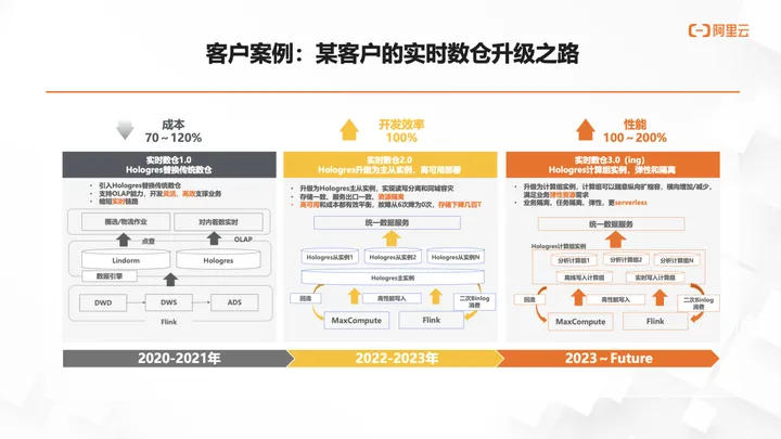 这个客户是Hologres和Flink比较早期的客户,在2020年,Hologres处于商业化的一年,客户将Hologres仅仅用来替换OLAP引擎。从最底层看起,使用Kafka加Flink进行加工,加工结束后,其数据需要进行双写,分别给物流作业系统和OLAP查询系统使用,前一个数据是高保障的,如果挂了,那整个仓管理就会出现混乱的状况。客户早期对Hologres产品还是有心存疑虑,所以一份写到Lindorm,对外提供重要服务的KV点查能力,一份写到Hologres,对内提供OLAP灵活分析。这是客户最早的一个做法,主要是替换OLAP引擎,利用Hologres的强大的写入与查询性能,对于他们来说主要实现成本降低70%-120%。