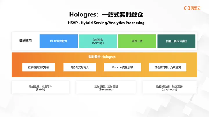 Hologres 是阿里云自研一站式实时数仓,以分析服务一体化架构,统一数据平台架构,实现一份数据,同时支持支持多维分析、在线服务、湖仓一体、向量计算多个场景,其中包含了: