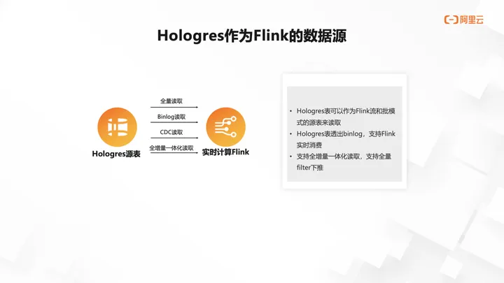 利用了Hologres的逐步更新,加上binlog配合Flink可实现一个实时用户画像的做法,它可以极大的降低成本。反过来的话,当Hologres作为Flink的源表来用,Flink通过流和批的模式都可以把这张表数据读出来。并且还可以自定义它的变化,例如全增量一体化读取,或者存量部分可以只读增量。