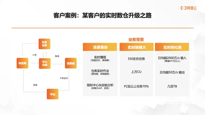 在以上三种业务之下,客户实时数仓大概拥有350左右的任务,用上了上万CU实时计算规模。同时对一些重要任务标定级,例如P2以上的任务,占它们的任务里面可能达到70%以上,可以看到实时对他们业务场景来说是非常重要的。其次是业务数据量实时吞吐高,日均流写入量是每秒钟2000万条。峰值的时候能到6000万条每秒,同时每天会产生每秒50万条以上的输出结果,整个数据量大概是在几百TB。