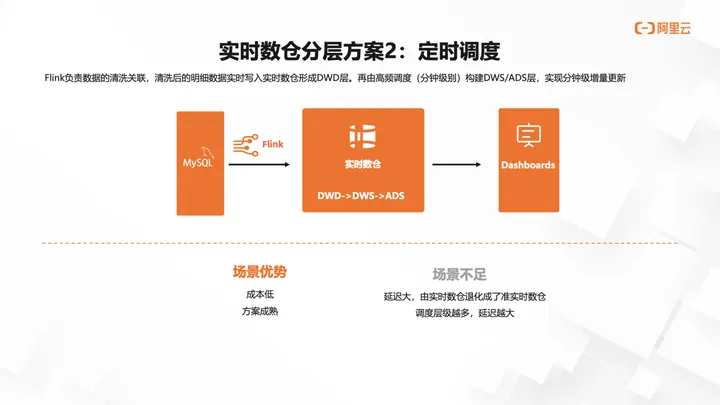 这样的好处是方案成熟简单,成本较低。但它的不足之处就是时效性差。因为Flink写进的数据其实很及时的,但是调度任务其实很难做到很高频调度。因为再往下做调度,比方5分钟的调度,它难度就一下子上去了。因为数据量大时有时候5分钟无法跑完数据,只能增量调度,将会更加复杂。所以许多用户在实际使用时候往往选择小时级别调度,实时数仓反而退化成了准实时数仓。