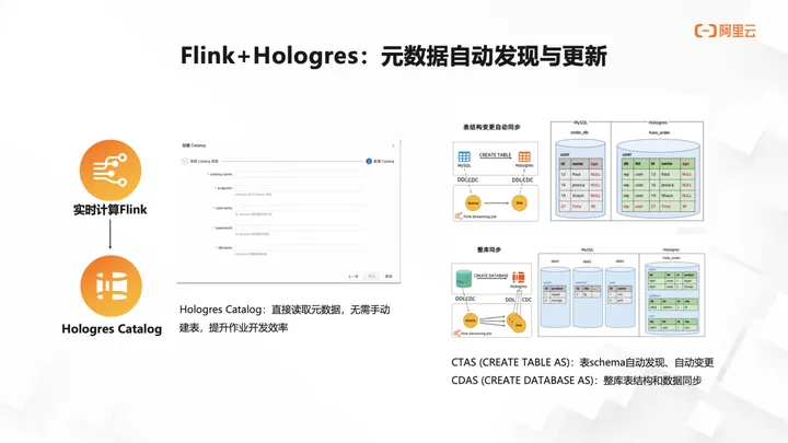 Hologres同时也对接了Flink的catalog,直接可以读取元数据,Flink的create table as和create database as这些语法,包括schema evolution都可以很好的适配。