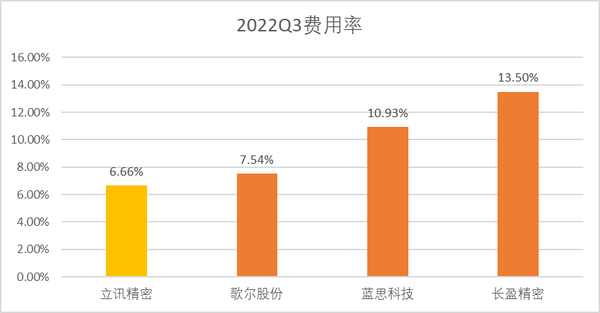 再从费用率的角度来看,以三季度三费占营收比重横向来看,立讯精密是同业中费用率最低的企业,在创造等量价值的前提下,立讯的管理费用花费更少,确实可以看出立讯在管理能力层面领先同业对手。