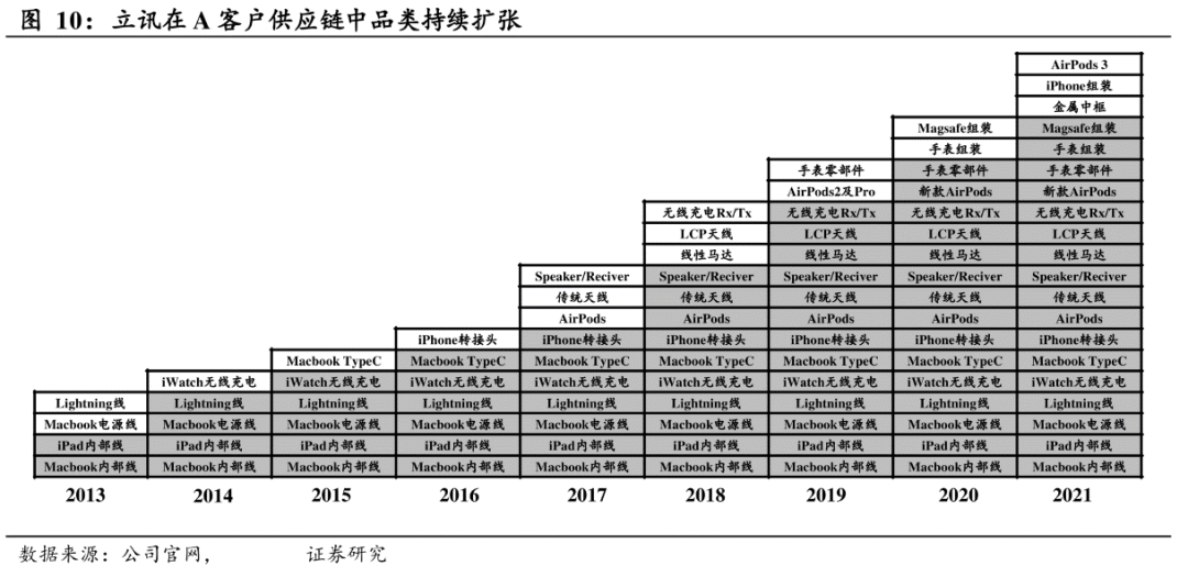 并且,以立讯为例,为苹果代工的产品零部件布局,也越来越广。立讯代工的果链零部件由2013年的4种持续提升,截至去年年底,已经提升至20种。