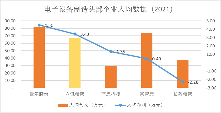 取得这样的成绩,前提是立讯2021年披露的员工人数超过22万,远高于富智康的7.4万及歌尔的9.6万。基数大的同时均值高,可见立讯在人员成本管理上优势明显。