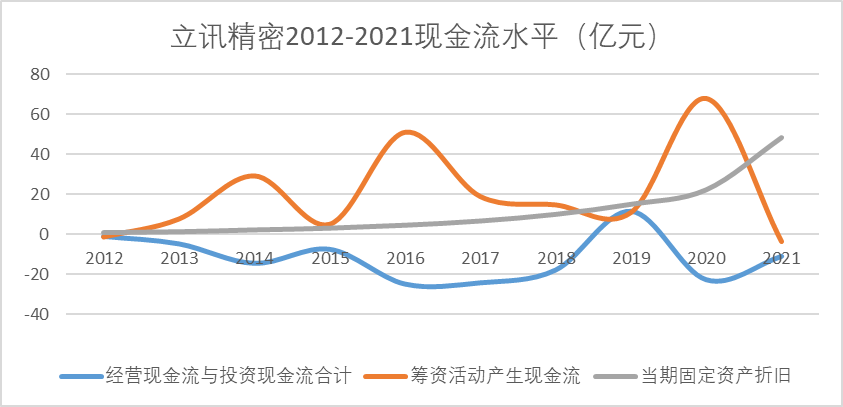 还有一个潜在的问题是,长期依赖苹果,毛利率水平低导致自有资金储备并不充足。因为对果链依赖程度高,立讯每年需要花费大量资金进行资本开支改造生产线和设备,这也导致其自由现金流水平一直较差,而设备折旧却节节攀升。