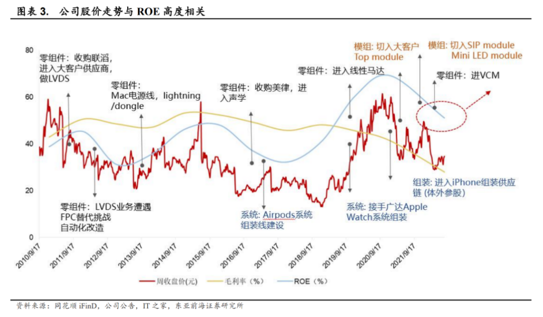 图:立讯股价与ROE毛利率关系示意图,来源:东亚前海证券研究所