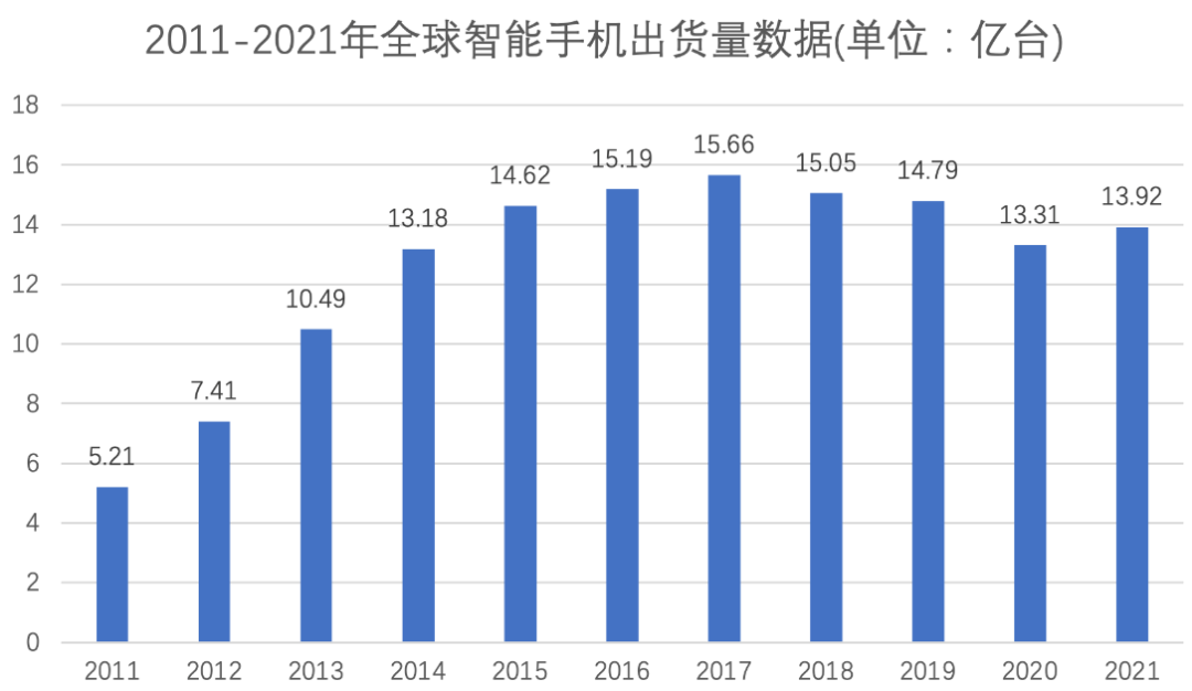 图:2011-2021全球智能手机出货量数据,来源:Counterpoint