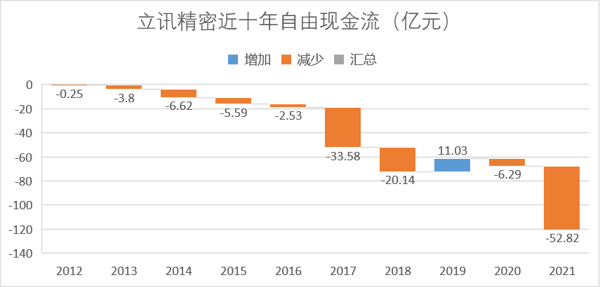 我们可以看到立讯近十年的自由现金流水平(本文取经营活动现金流净额-购买固定、无形、长期资产支出)越来越差。