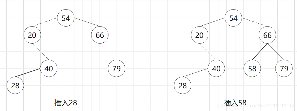 插入结点的过程如下:若原二叉排序树为空,则直接插入该结点,否则,若关键字k小于根结点值,则插入到左子树,若关键字k大于根结点值,则插入到右子树,插入的结点一定是一个新添加的叶节点,且是查找失败时查找路径上的访问的最后一个结点的左孩子或右孩子,过程如下图所示: