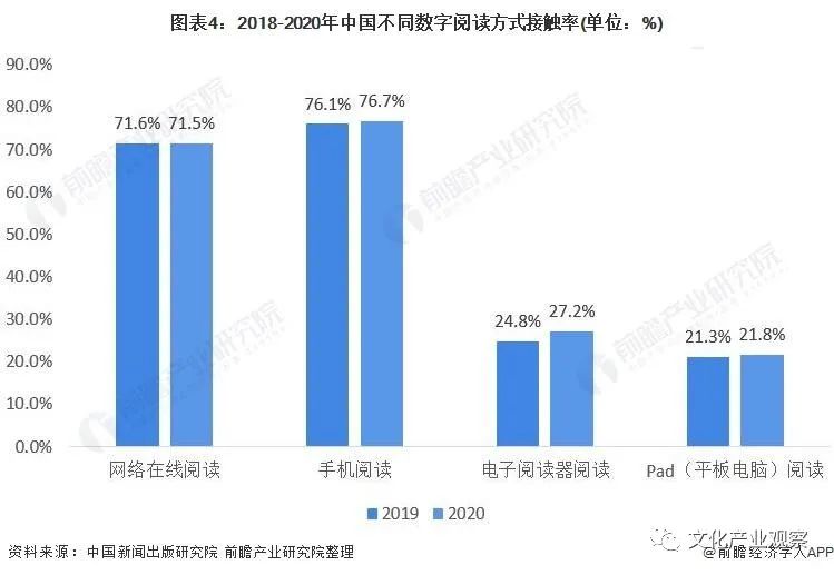 据相关报告显示,2020年中国成年国民数字化阅读方式的接触率为79.4%,2020年,有76.7%的成年国民进行过手机阅读,27.2%的成年国民在电子阅读器上阅读。从时长上来看,人均每天手机接触时长,达100.75分钟,而人均每天电子阅读器阅读时长,仅11.44分钟。