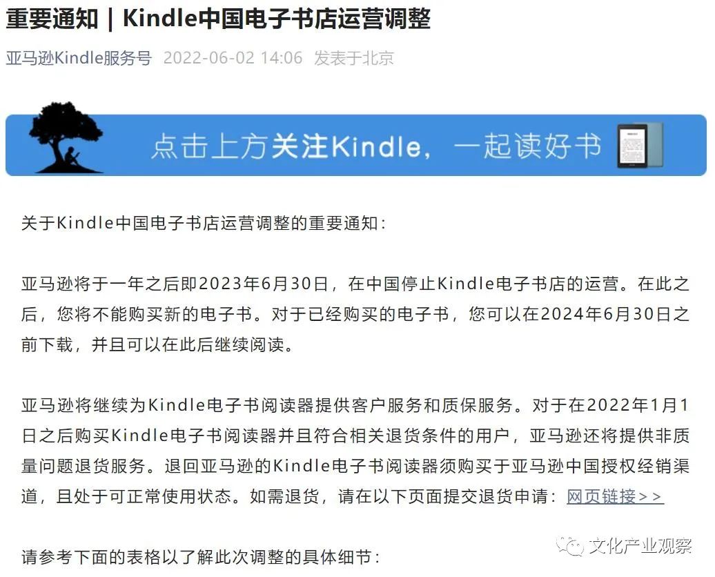 6月2日下午,亚马逊服务号发布公告称,亚马逊将在一年后,即2023年6月30日,在中国停止Kindle电子书店的运营。在此之后,用户将不能购买新的电子书。对于已经购买的电子书,用户可以在2024年6月30日之前下载,并且可以在此后继续阅读。