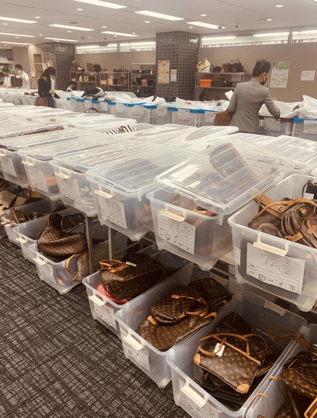 小红书上,拍卖会上的视频片段,拼凑出一场价格博弈的全貌:在拍卖现场,各个品牌的二手包分别装在半透明塑料箱里。箱子紧挨着摆放在两排架子上,那壮观的场景让人不禁觉得交易对象是蔬菜水果而不是奢侈品。