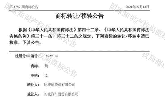 起初,魏牌的商标并不在长城汽车的手上。原本魏牌注册在比亚迪旗下,作为其王朝系列中备用的品牌之一。2021年,经过几经辗转,长城汽车从比亚迪手中受让,迎接回来。