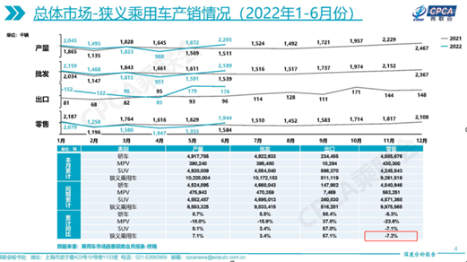 图:乘用车2022年1-6月产销情况 来源:乘联会