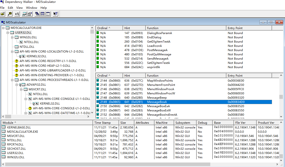 拖一个有图形界面的PE文件进去,查看user32.dlll的基地址(0x69E00000)和MessageBoxA的偏移地址(0x000834D0)