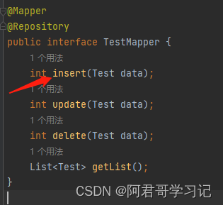 Mapper层:TestMapper.java,创建一个mapper接口,添加业务逻辑方法,是与数据库交互的方法