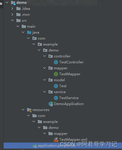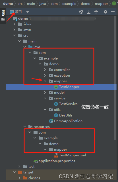 选择项目,展开文件夹resources,然后创建以下子文件夹,(com>example>demo>mapper,注意这里的demo是你项目的名字)再创建一个TestMapper.xml,作为 TestMapper.java的映射;注意文件夹一定要按照TestMapper.java放置的位置一 一对应,如图框选处;