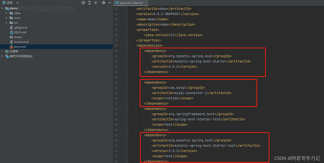 项目中的根目录有一个pom.xml文件,其中框选的内容即是注入的MYSQL Driver和MyBatis Framework的依赖,其作用是实现操作数据库mysql,以及运用mybatis与xml的映射方法实现与数据库交互的作用;之后需要某些功能,可以在这里添加相应的依赖。