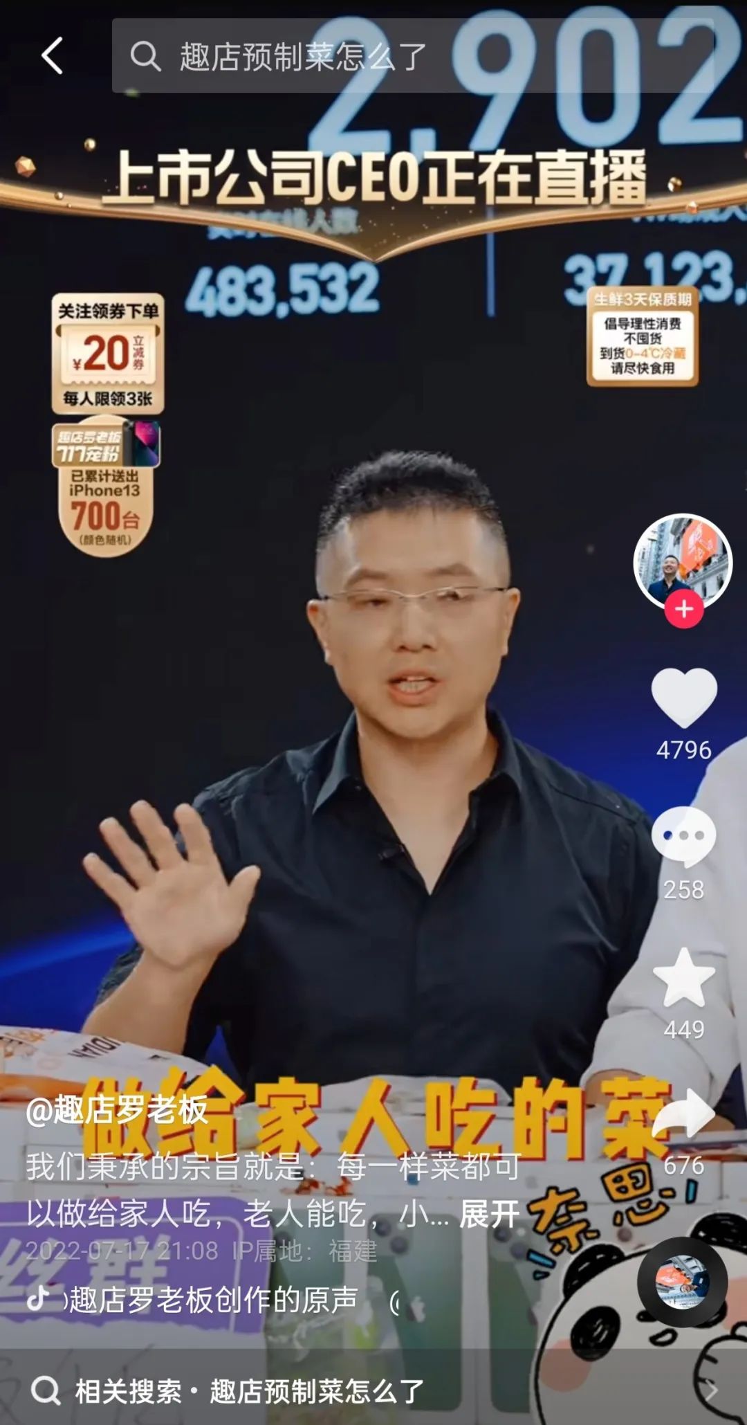 趣店就这样与罗敏的个人奋斗史绑定在一起,成为他的一个标签。所以在今年投入预制菜创业时,他依旧顶着「趣店罗老板」的名头,高调宣传这个「利他」的项目。