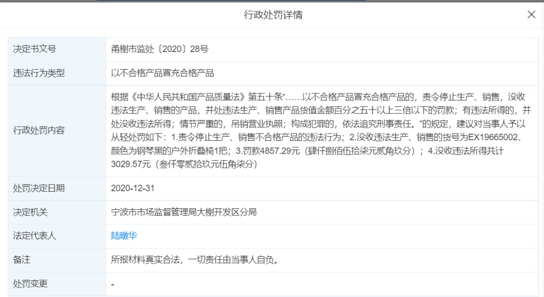 其中2020年12月的处罚详情显示,其违法行为类型是“以不合格产品冒充合格产品”,具体内容是:浙江省轻工业品质量检验研究院根据分局的委托,对分局2020年9月3日抽样取证的当事人待销的、合格的、货号为EX19665002、颜色为钢琴黑的户外折叠椅进行检验,于2020年9月29日出具编号为200066280003的检验报告,显示力学性能(座背静载荷)项目不符合其明示标准QB/T4458-2013《折叠椅》的要求。