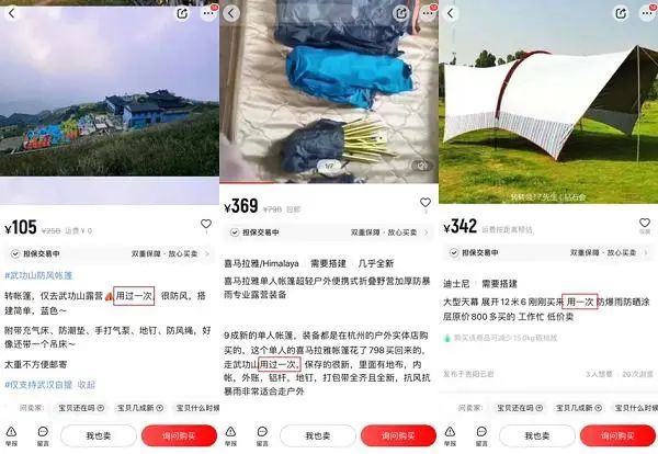 锌刻度在二手平台搜索“露营装备”后发现,像林淼这样的人还有很多,不少人正在售卖“几乎全新”的露营装备,从帐篷、天幕到编织篮、月亮椅……商品介绍中也多提及,“用途仅摆拍,没有实际用过”、“带出去露营过一次就闲置了,没什么使用痕迹”等等。