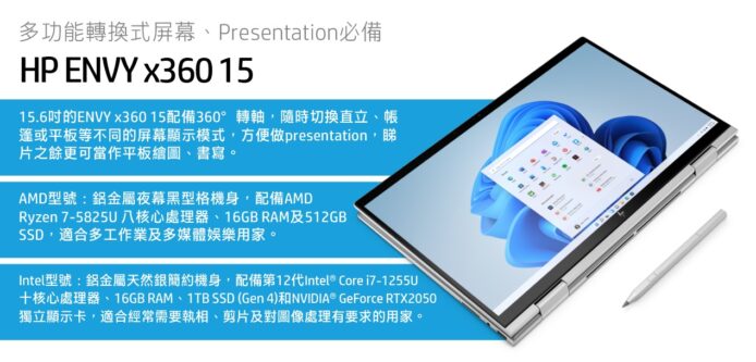 多功能轉換式屏幕、Presentation必備 — HP ENVY x360 15