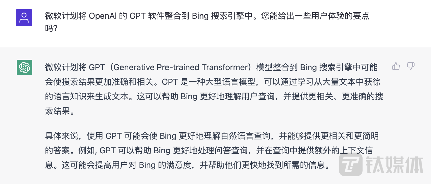 钛媒体App编辑向ChatGPT提问关于GPT与搜索结合优势的相关回复