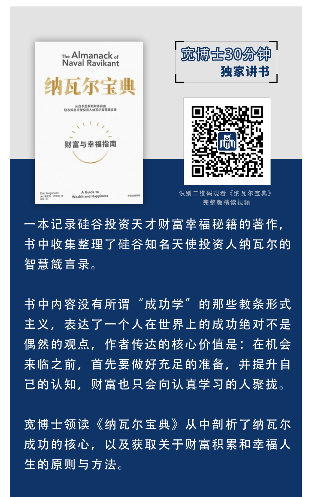 工作怎样才是对自己有意义的,也许见仁见智,但学习却是终身性的,****宽博士独家解读《纳瓦尔宝典》,从书中总结了纳瓦尔的“理性佛系”的经济思想,并从中剖析了纳瓦尔成功的核心,帮助大家在生活中做自己、找杠杆,构建自己的体系及能力,成为终身学习者,实现自己精彩的人生。