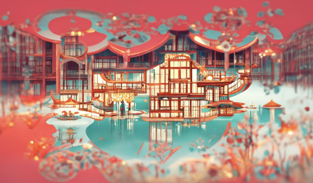 设计师栗米桃最先接触的AI生成工具是由国内团队打造的生成式AI平台——TIAMAT,只用了一个月的时间就能熟练操作。以TIAMAT为例,输入关键词“中国旅店、夏日池塘、浪漫主义、古典和赛博科技的结合、c4d渲染、maya渲染、散发金属光泽、装饰管线”后,三四分钟后,便会得到如下的效果图:
