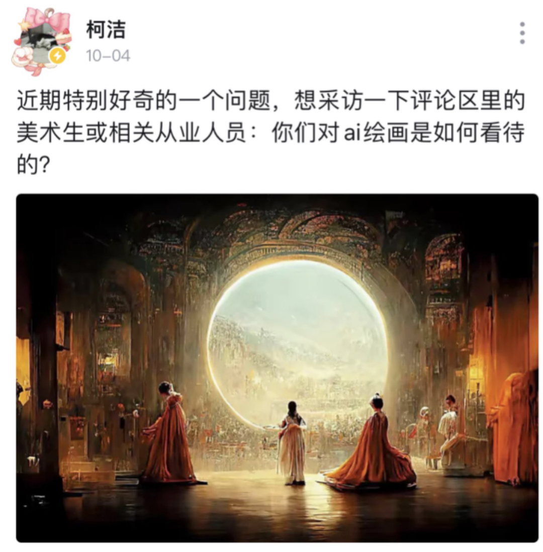 柯洁选择的配图也别有巧思,是今年在美国科罗拉多州博览会上获得数字艺术/数码摄影单元竞赛一等奖的作品《空间歌剧院》,该作品借助AI绘画工具Midjourney制作而成,却一举打败了人类设计师并最终夺魁。评论区自称为美术相关从业者们表示终于理解了柯洁和阿尔法对弈的感受。