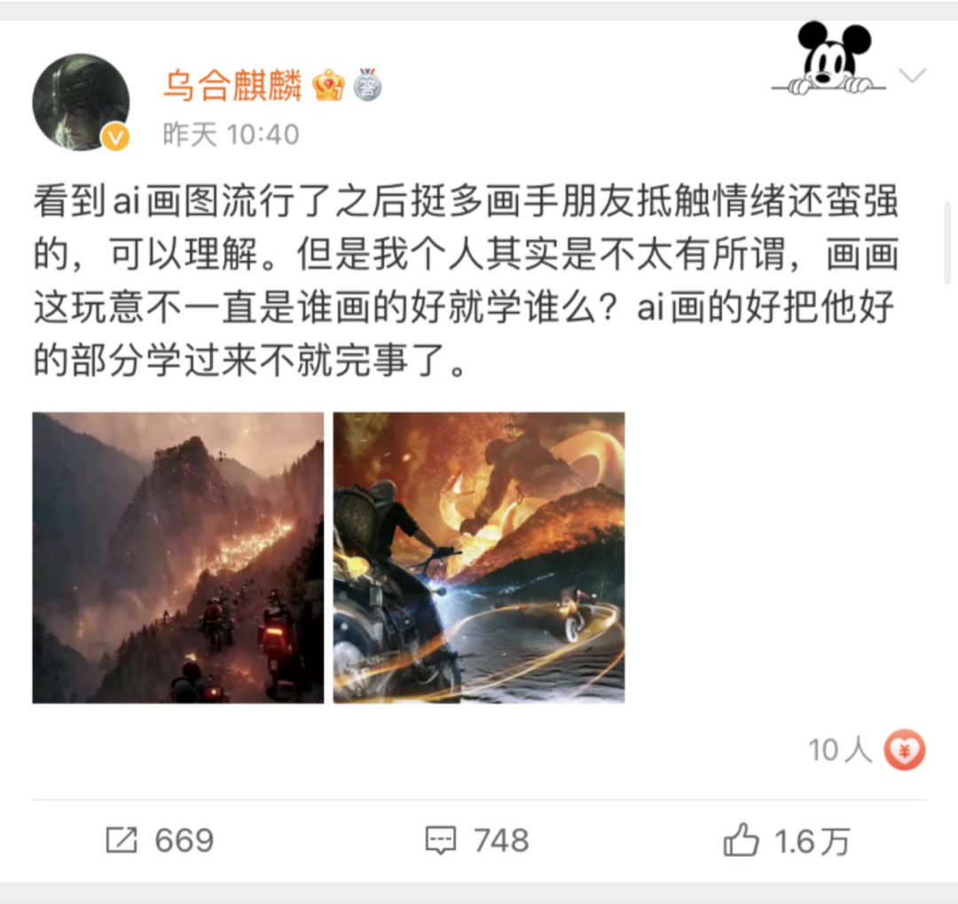 12日,CG画师乌合麒麟一条关于AI绘画的讨论登上了微博热搜榜。