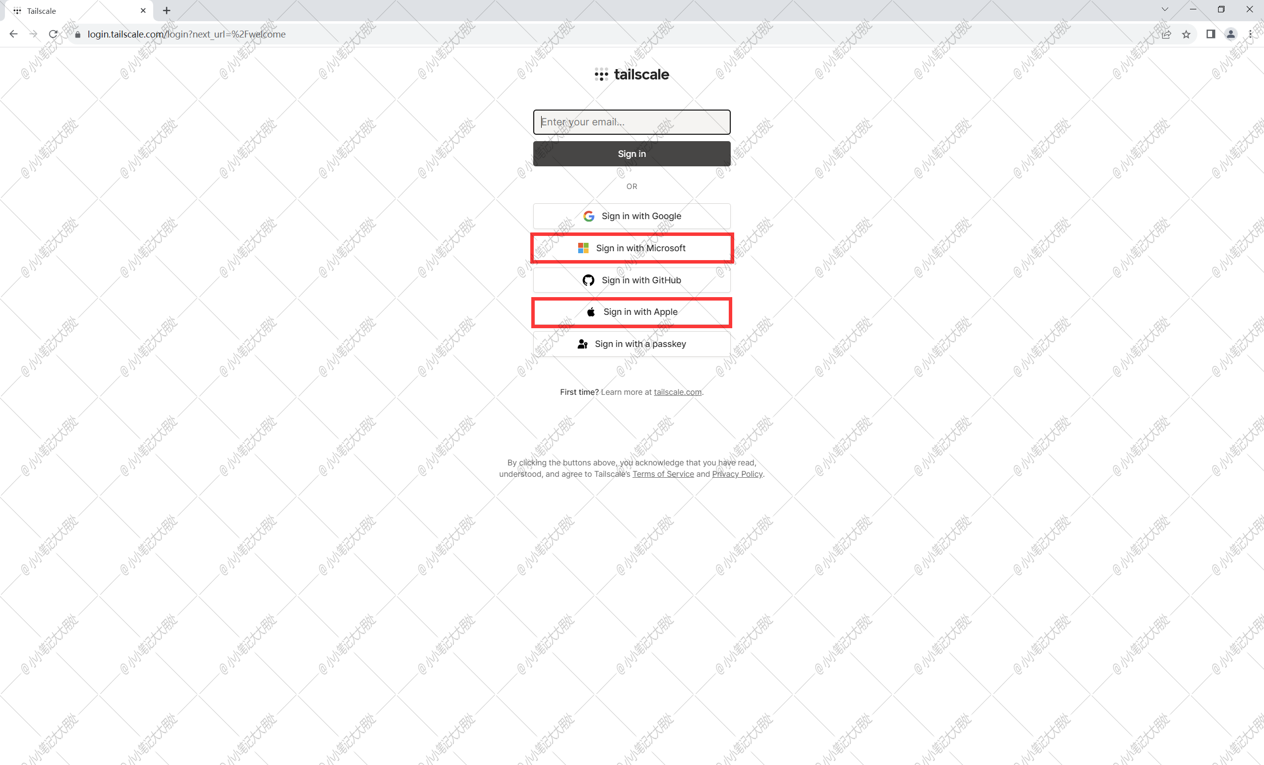 - 打开Tailscale官网(https://login.tailscale.com),推荐使用**微软账号**或者**苹果账号**进行注册登录。